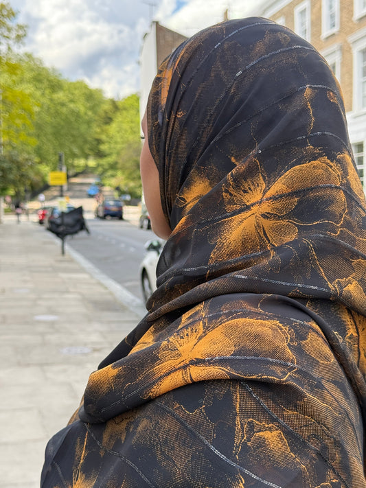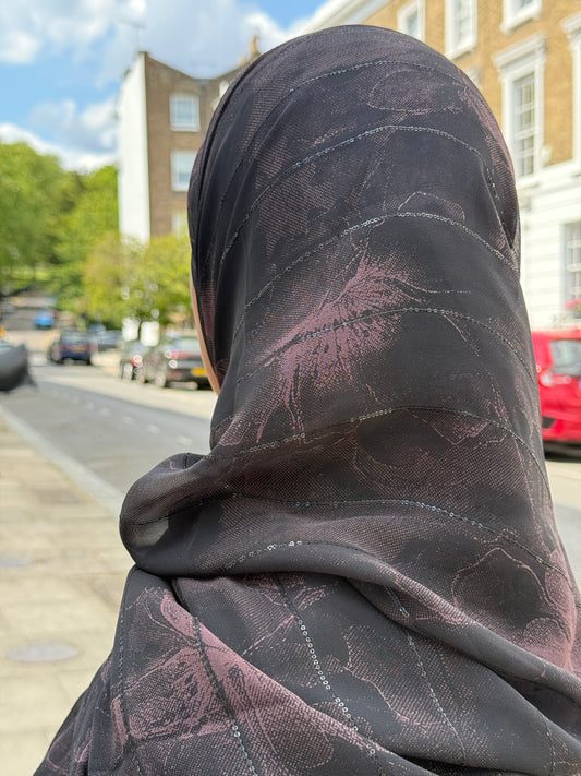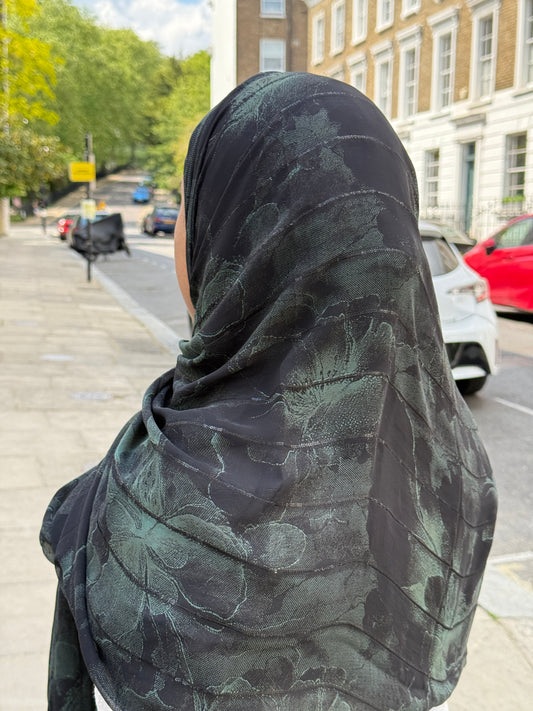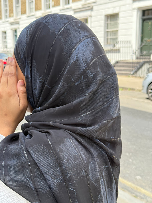 The midnight hijab is made of a soft chiffon. It features a floral pattern combining soft hues that blend seamlessly. The fabrics lightweight texture drapes elegantly while remaining breathable and comfortable making it perfect for everyday wear and special occasions.