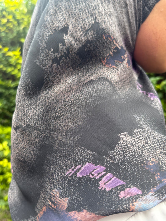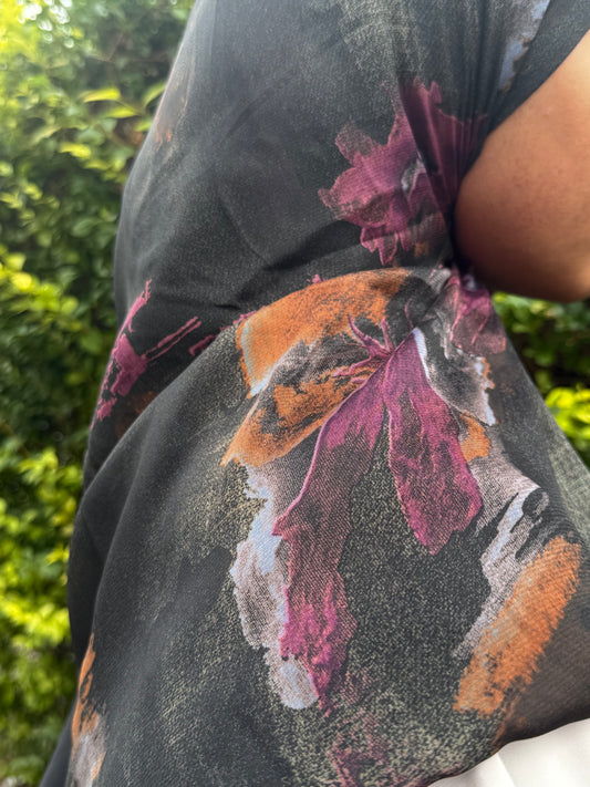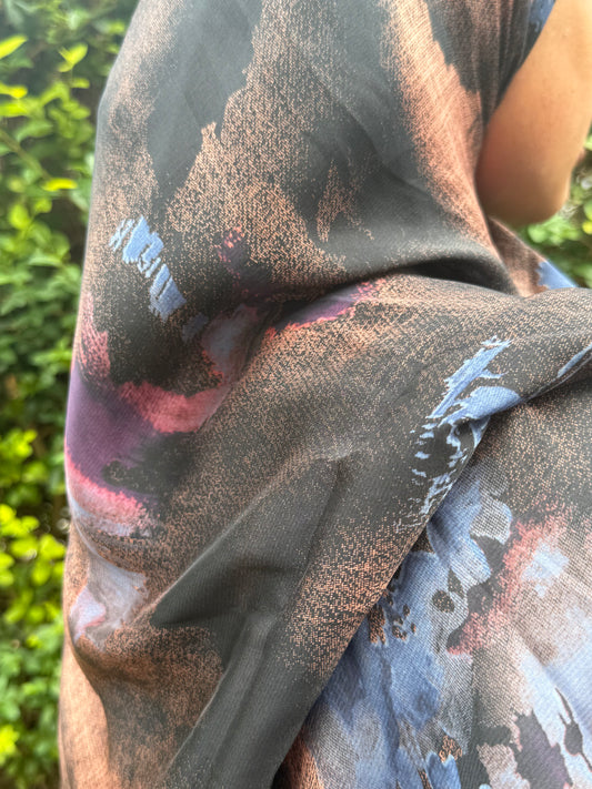 The hijab is made of a soft chiffon. It features a brushstroke, floral pattern combining soft hues that blend seamlessly. The fabrics lightweight texture drapes elegantly while remaining breathable and comfortable making it perfect for everyday wear and special occasions.